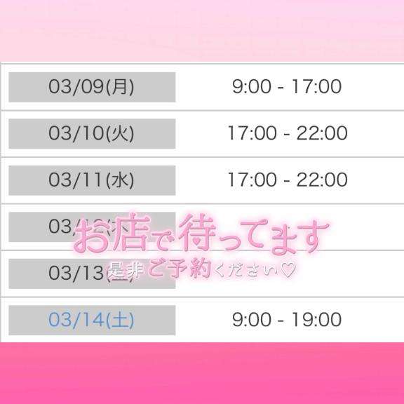 こんにちは!今週もよろしくお願いします!今日から4??連勤( ?? ? ??)???????皆さんにたくさん会えるのとっても嬉しい〜〜!ご予約してくださって本当にありがとうございます?まだまだ空いてる時間たくさんあるのでお待ちしてます?今日は13:00~20:00までです???♀?