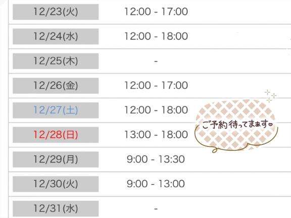 12/23(火)12-17時 サンタコス?12/24(水)12-18時 サンタコス?12/26(金)12-17時12/27(土)12-18時